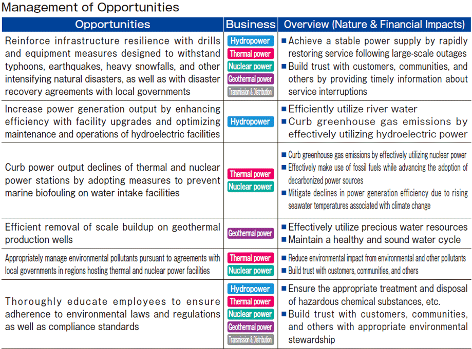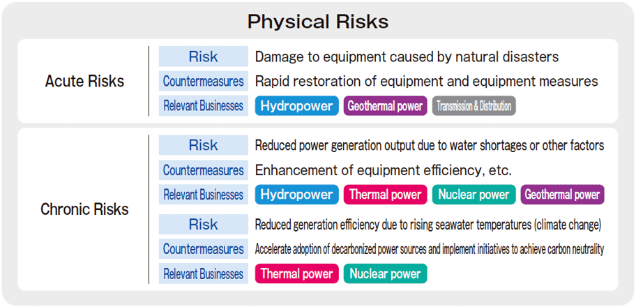 Based upon the assessed dependencies and impacts, we identified specific nature-related risks and countermeasures relevant to our electric power operations.