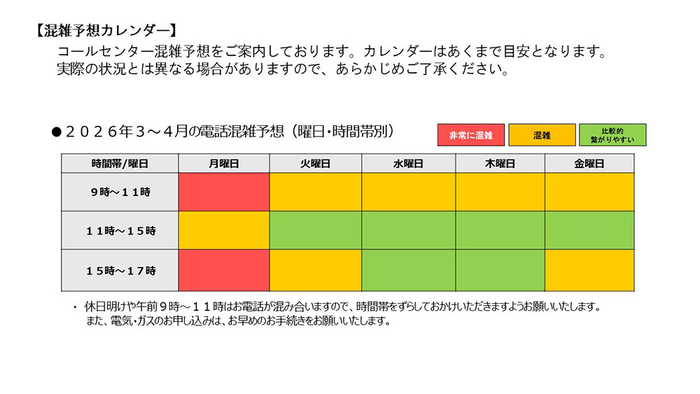 コールセンター混雑予想をご案内しております。カレンダーはあくまで目安となります。